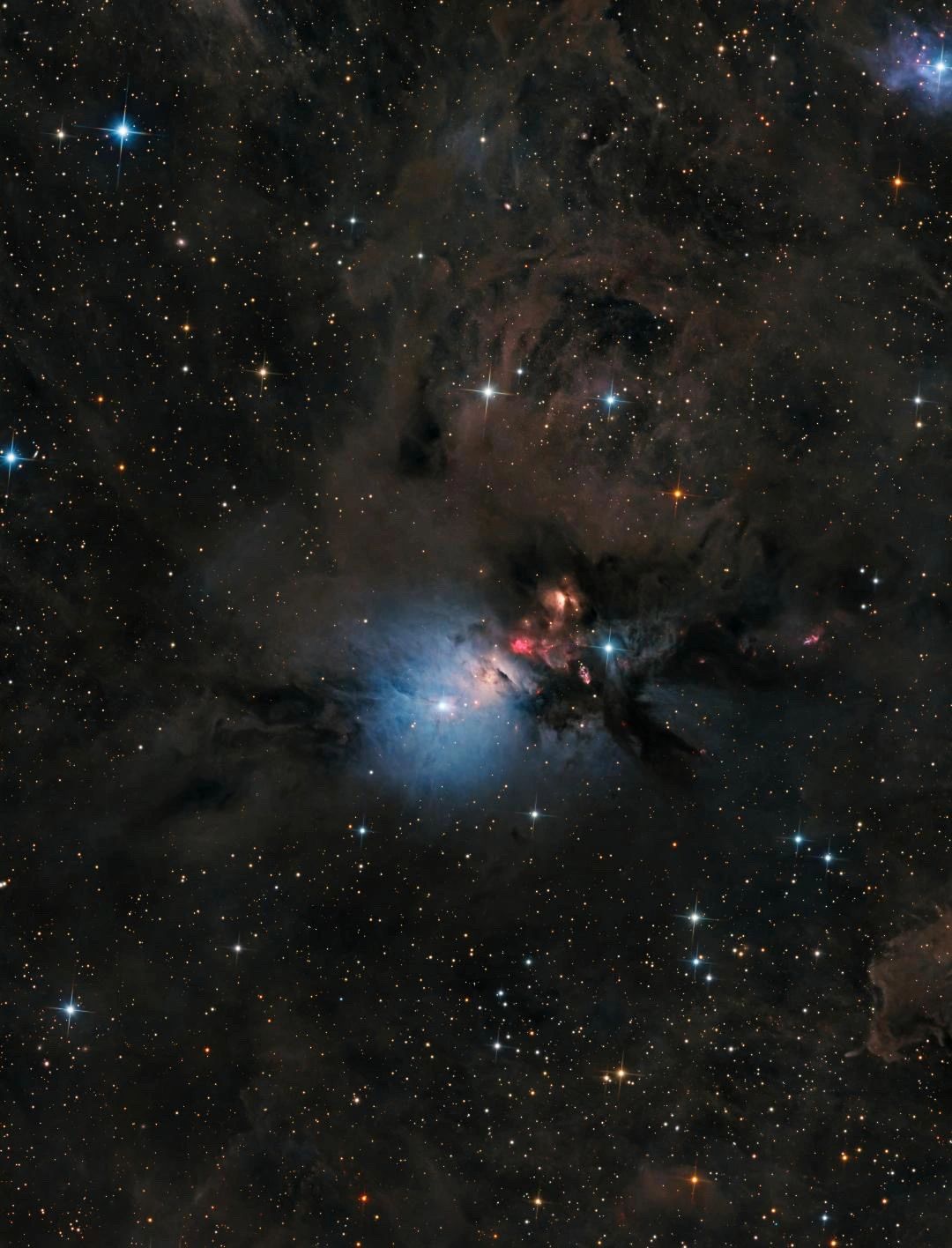 Nestled within the Perseus Molecular Cloud, NGC 1333—known as The Embryo Nebula—is a vibrant stellar nursery where new stars are actively being born. Swirling curtains of dark cosmic dust weave through glowing clouds of gas, illuminated by the intense light of young, forming stars. The striking blue reflection nebula contrasts beautifully with the deep reds of energized hydrogen, revealing the dynamic processes shaping this region of space.